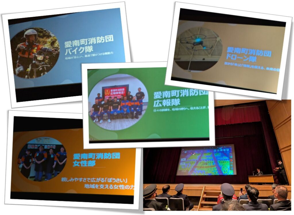 親しみやすさで広がる「ぼうさい」 地域を支える女性の力と題し、女性部・立石副分団長から、どうすれば愛南町を守れるか考え抜かれた熱意のつまった活動の報告と、令和9年度全国女性消防操法大会へ向けての活動開始報告がありました。