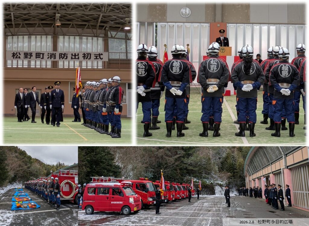 雪がちらつく極寒のなか、令和8年松野町消防出初式が執り行われ、115名の消防団員が参集しました。